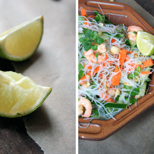 Karottenstreifen, Gurkenstreifen, Glasnudeln und Kräuter in eine große Schüssel geben und gut vermengen. Zwiebel, Garnelen und Erdnüsse hinzugeben, noch einmal gut vermischen